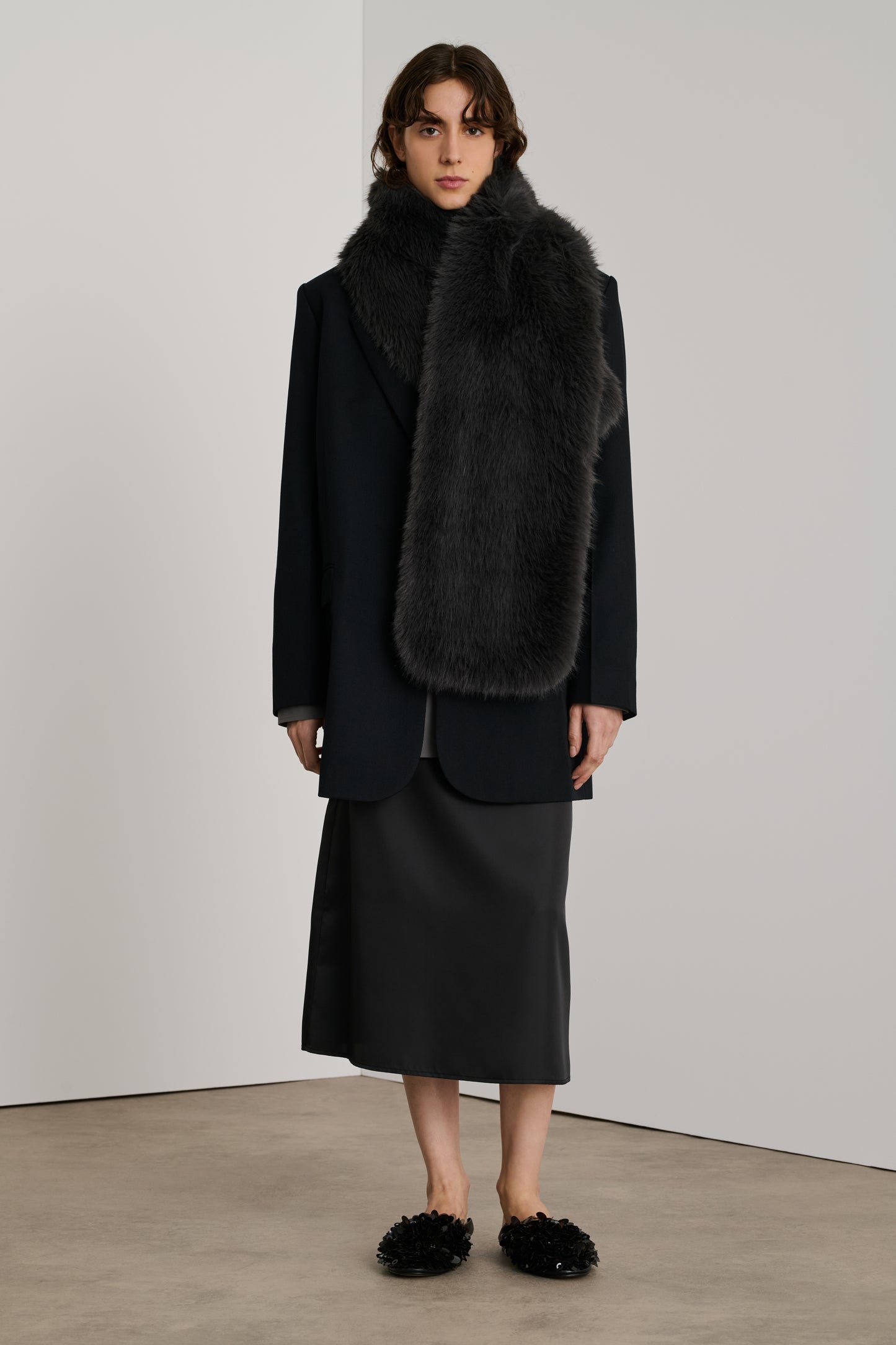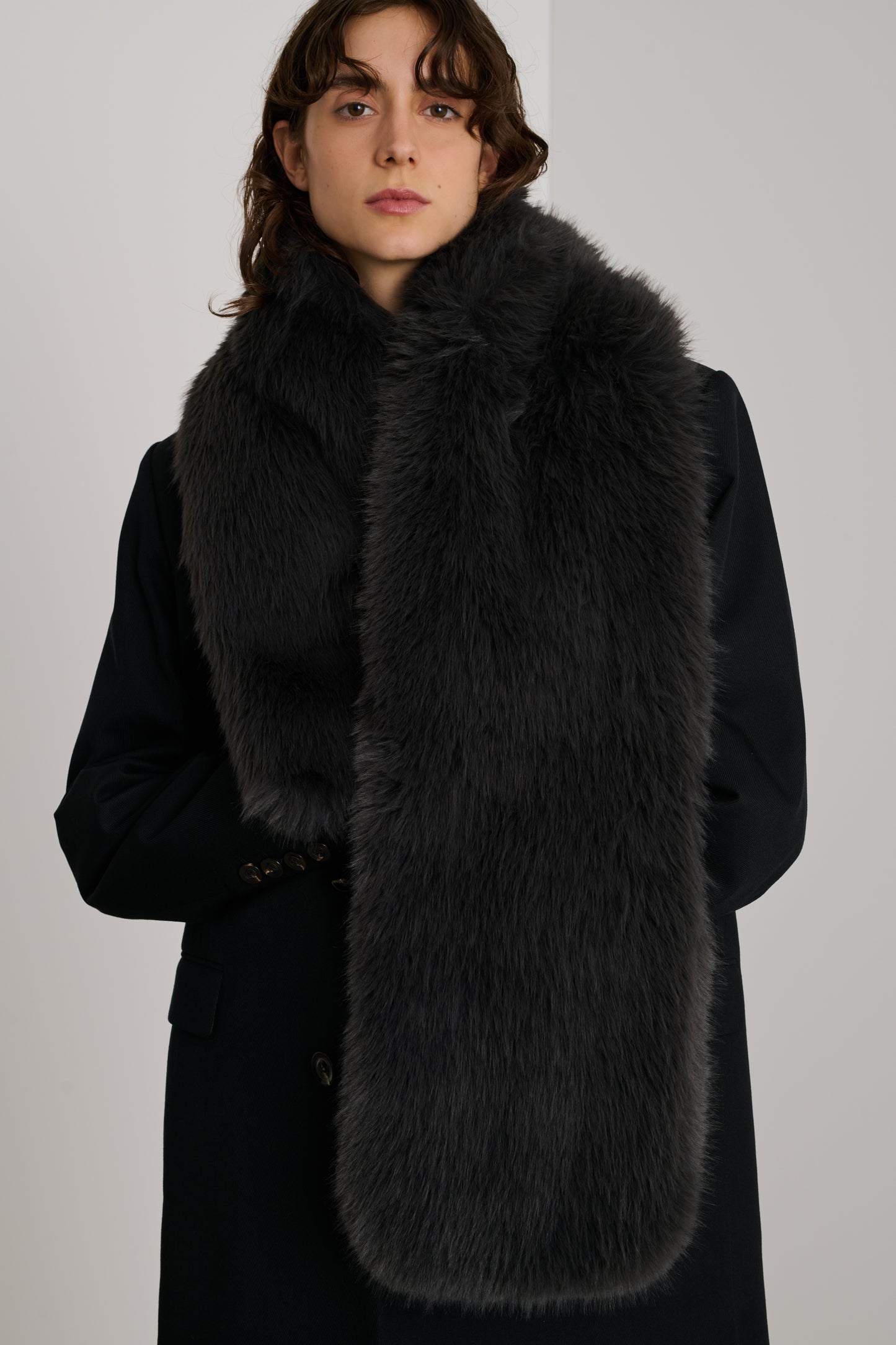 RUBY is a faux fur scarf. Dark anthracite in colour, with voluminous fur, this collar can be worn over a blazer or shirt to warm up a winter outfit.