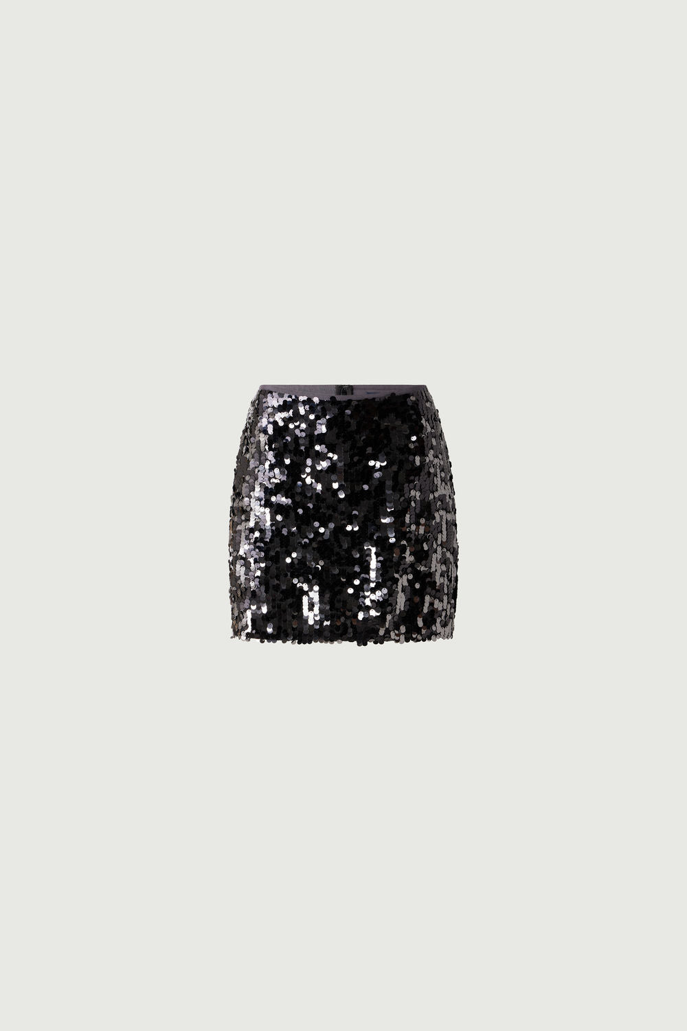 ROBBIE is a short skirt made from a sequinned fabric. Shades of blue and charcoal grey combine to create a unique hue that will enhance your evening outfits. Fully lined, it sits low on the hips. The cut is short and straight.
